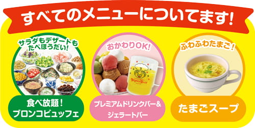 これらのすべての「おこさまメニュー」には食べ放題ブロンコビュッフェ、プレミアムドリンクバー、ジェラートバー、たまごスープがセットになっています。