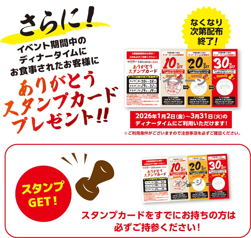 140店舗突破大感謝祭の第1弾〜第3弾のディナータイム(16時以降ご入店)にお食事いただくと、スタンプカードのお渡し、またはスタンプを押印します。
