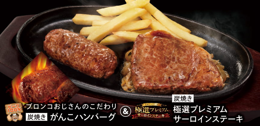 炭焼き極選プレミアムサーロインステーキと人気No.1 のビーフ100% ハンバーグが楽しめるコンビがオススメ!