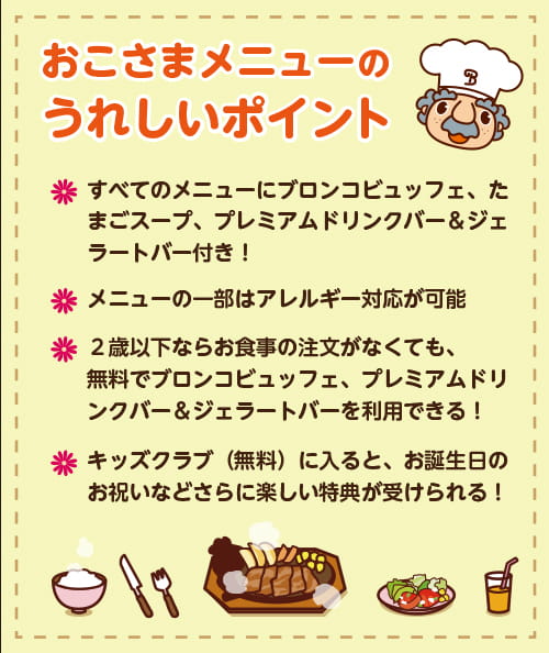 ご家族でのお食事のお出かけには、ぜひブロンコビリーのおこさまメニューをお試しください♪
