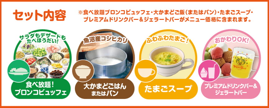 本格鉄板メニューでおとなの仲間入り♪ ※こちらの商品は九州地区の店舗では取り扱いがございません。何卒ご了承をお願いいたします。 本格鉄板で食べ応えバツグンのステーキ! ※12歳までのおこさまの特別メニューです。 ※アレルギー表をご用意しております。 ※キッチンでは同一の調理器具・食器・揚げ油を使用し食材を扱っているため、アレルゲンに関する情報は絶対的なものではありません。ご理解の上ご利用ください。 ※ランチタイムの食べ放題ブロンコビュッフェはグルメサラダ、店内仕込みデザートが付きます。 ※ディナータイムの食べ放題ブロンコビュッフェはグルメサラダ、店内仕込みデザート、スパイス研究所カリー、ご褒美スイーツが付きます。 トッピング一覧 エビフライ 100円(税込110円) 果汁100%りんごジュース 100円(税込110円) カテゴリ一覧に戻る