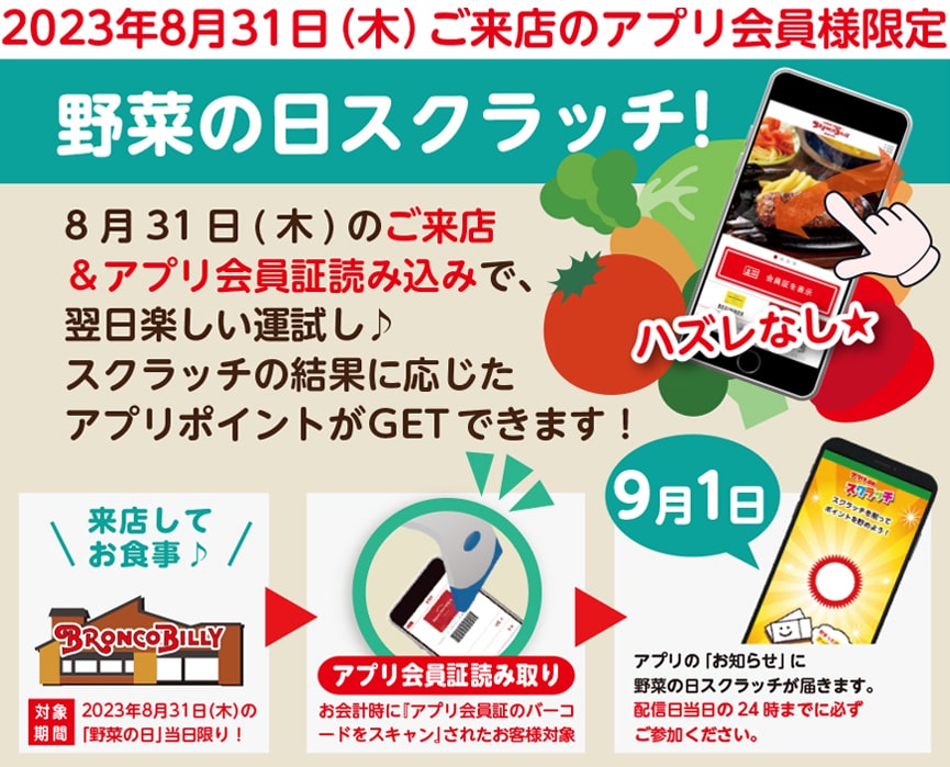 2023年8月31日(木)にご来店&公式アプリの会員証を読み込まれたご来店履歴のあるアプリ会員様に翌日の9月1日(金)に「野菜の日スクラッチ」をお送りします。